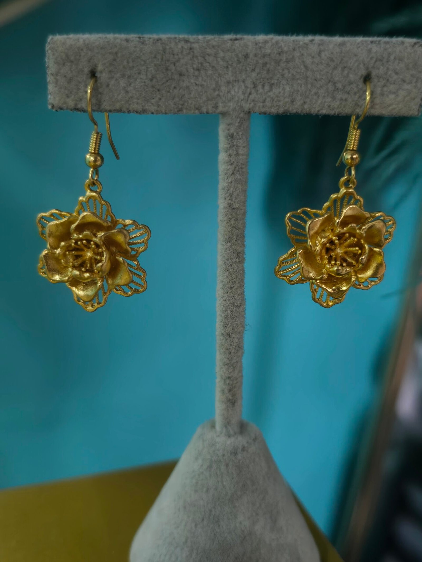 Gold flower-shaped dangle earrings.