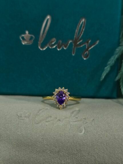 Red CZ pear cut gem with CZ embedded gold band ring.